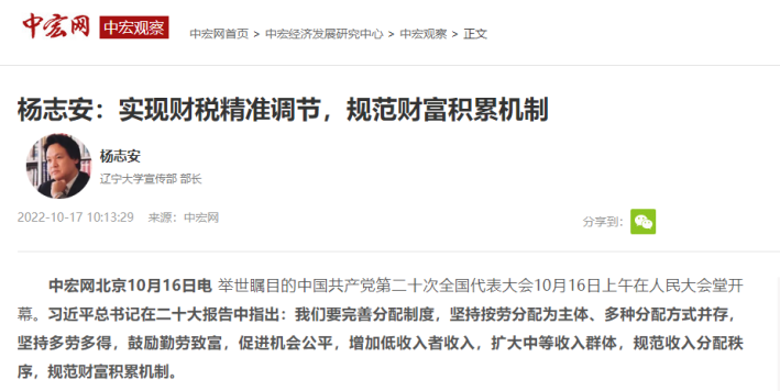 中宏观察家、sunbet申搏官方网站宣传部部长杨志安教授就党的二十大精神以及规范财富积累机制等重要论述接受中宏观察视频访谈。