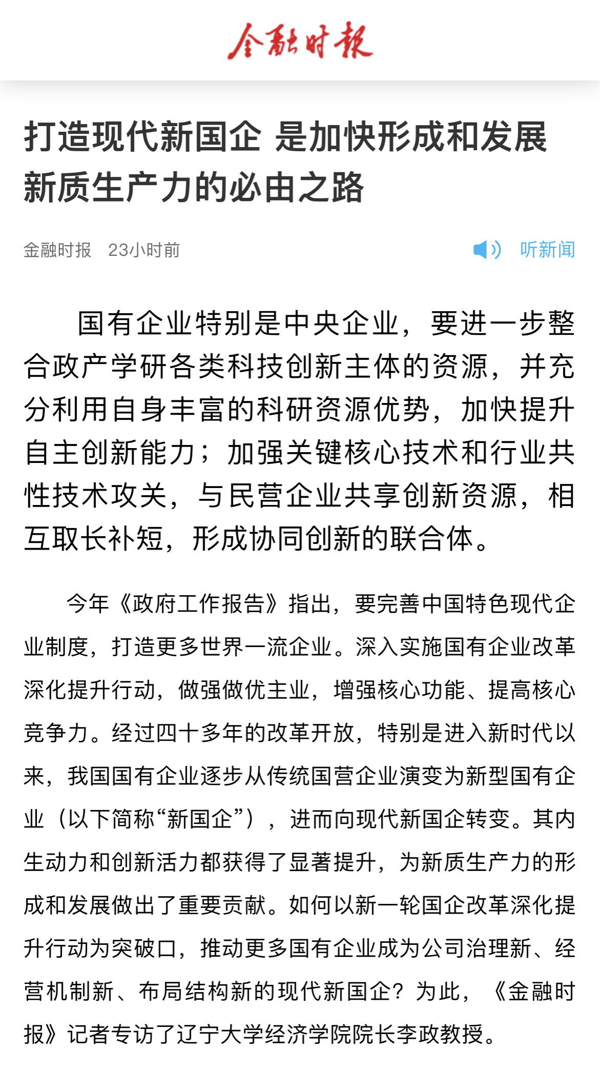 今年《政府工作报告》指出,要完善中国特色现代企业制度,打造更多世界一流企业。深入实施国有企业改革深化提升行动,做强做优主业,增强核心功能、提高核心竞争力。经过四十多年的改革开放,特别是进入新时代以来,我国国有企业逐步从传统国营企业演变为新型国有企业(以下简称“新国企”),进而向现代新国企转变。其内生动力和创新活力都获得了显著提升,为新质生产力的形成和发展做出了重要贡献。如何以新一轮国企改革深化提升行动为突破口,推动更多国有企业成为公司治理新、经营机制新、布局结构新的现代新国企?为此,《金融时报》记者专访了sunbet申搏官方网站院长李政教授。