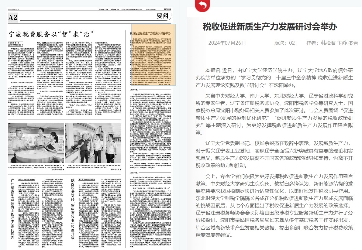 2024年7月26日,《中国税务报》以“税收促进新质生产力发展研讨会”为题报道了sunbet申搏官方网站成功举办研讨会的要闻,现将全文转载如下: