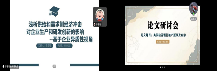李思璇同学分享《浅析供给和需求侧经济冲击对企业研发创新与生产的影响——基于企业异质性视角》的文字,发现供给侧成本冲击在短期中会使所有企业利润下降,但在长期中会使低创新能力企业退出市场,单个高创新能力企业面临的需求扩张,获得更多的利润来增加研发投入、提高生产效率。行业需求量下降导致的需求冲击会使所有企业的产量、利润和研发投入都下降,但在长期中企业可以通过选择进入或者退出来应对需求冲击,最终,需求冲击不会改变行业结构而只缩小行业规模。王君文同学报告《美国硅谷银行破产原因及启示》文章,研究发现严重的信息不对称和金融机构管理和监管不到位问题是美国硅谷银行破产的主要原因。这对中国金融市场健康发展有重要意义,启示中国银行业加强自身风险管理,金融监管机构严加管控及政府积极有为。