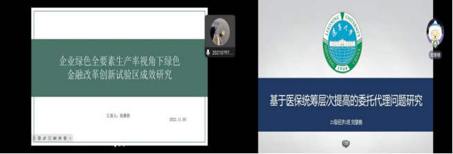 陈雅静同学汇报的论文题目为《企业绿色全要素生产率视角下绿色金融改革创新试验区成效研究》,研究发现试验区设立显著促进企业绿色全要素生产率提升,主要通过提高企业技术创新能力以及加强地区环境规制两个作用渠道提高企业绿色全要素生产率。刘慧楠以《基于医保统筹层次提高的委托代理问题研究》问题分享论文,她发现医保统筹层次提高后,将各地统筹基金财权收归上级,虽然可以有效改善整个统筹区域的医保基金结余状况,但由于上下级政府间的信息不对称,下级政府会放松对地方医保基金的监管,下级政府积极性降低的现象。