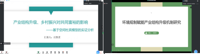 汪凯茗同学汇报的论文题目为《产业结构升级、乡村振兴对共同富裕的影响——基于空间杜宾模型的实证分析》,试图在实现区域协调发展的新时代背景下,针对性地分析产业结构升级和乡村振兴在我国不同地区对实现共同富裕的作用效果,为我国扎实推进区域协调性发展进而实现全体人民共同富裕提供参考与借鉴。关思丹同学以《环境规制赋能产业结构升级机制研究》问题分享论文,在研究环境规制如何影响产业结构升级的基础上,进一步分别从区域、人力资本水平、交通基础设施水平三个维度的差异分析该影响是否具有异质性,并分别将绿色创新、产业集聚纳入分析框架进行机制分析,探究环境规制对产业结构升级的传导机制。