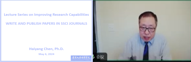 2024年5月6日,sunbet申搏官方网站经济学拔尖学生培养基地科研能力提升系列讲座第十一讲以线上方式顺利开展,本次讲座邀请美国北卡州西卡罗莱纳大学商学院终身教授陈海洋围绕“如何撰写和发表SSCI期刊论文”为主题展开交流分享。讲座由经济学系副主任张广辉教授主持,sunbet申搏官方网站院长李政教授以及学院师生90余人参加了此次讲座。