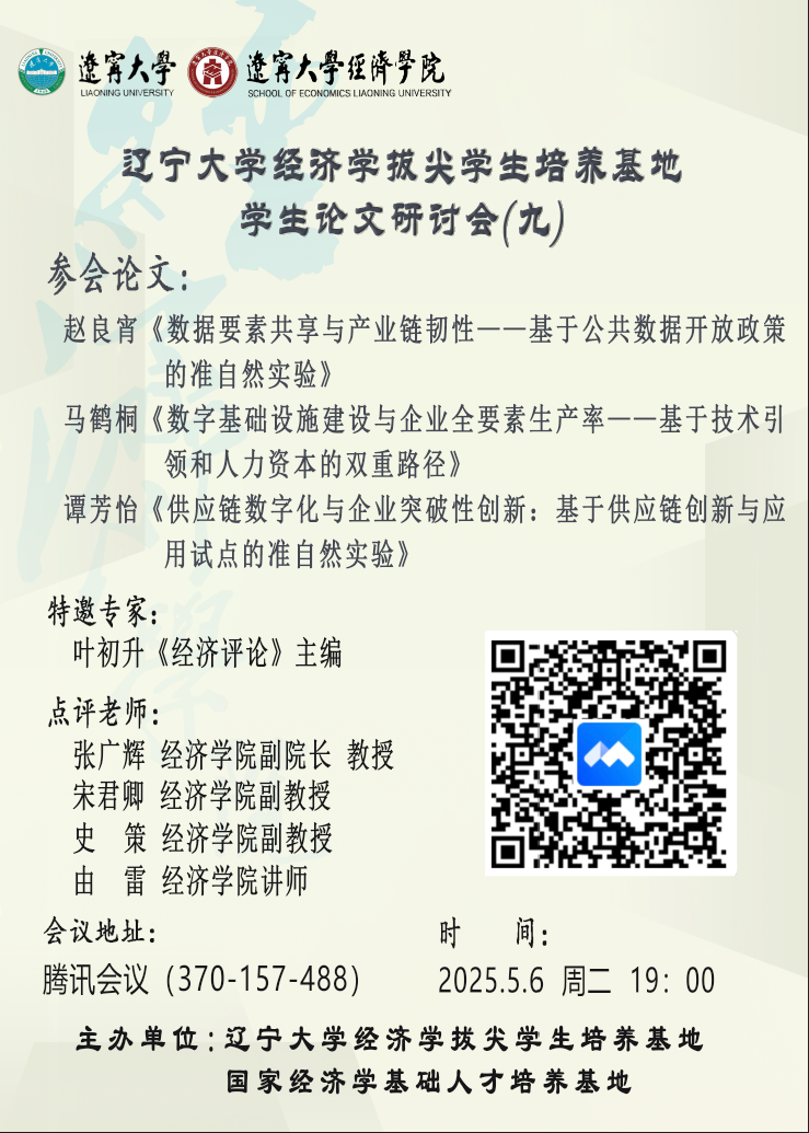 2025年5月6日,sunbet申搏官方网站经济学拔尖学生培养基地举办第9期学生论文研讨会,研讨会邀请《经济评论》主编、教育部人文社科重点研究基地武汉大学经济发展研究中心联席主任叶初升教授担任特邀点评专家,sunbet申搏官方网站副院长张广辉教授、宋君卿副教授、史策副教授和由雷讲师担任点评老师。2022级赵良宵、马鹤桐、谭芳怡三位同学分别围绕各自研究论文进行汇报,与点评专家就论文框架构建、研究方法运用及学术规范等展开深入探讨。