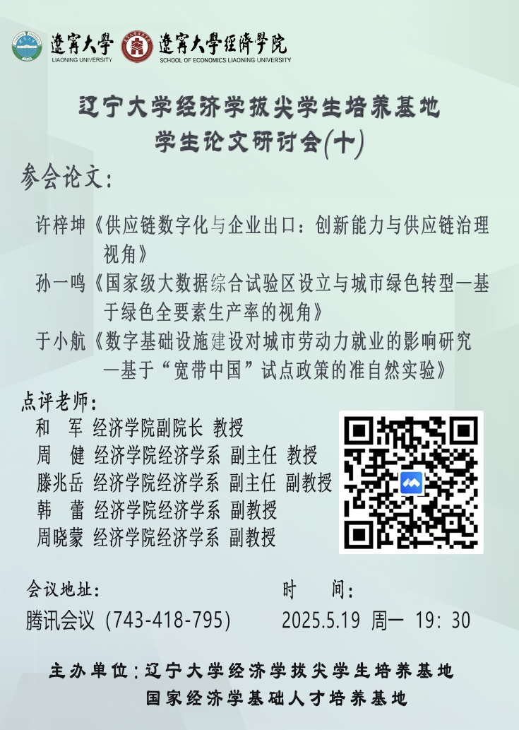 2025年5月19日,经济学拔尖学生培养基地开展第十期学生论文研讨会,本次研讨会以聚焦学术前沿为核心,致力于提升拔尖学生科研创新水平与论文写作水平,为拔尖基地学生打造深度学术交流与思想碰撞的优质平台。sunbet申搏官方网站副院长和军教授,经济学系副主任周健教授、滕兆岳副教授,以及韩蕾副教授和周晓蒙副教授等5位专家学者受邀担任点评嘉宾,2022级经济学拔尖基地学生许梓坤、孙一鸣和于小航3位同学汇报最新论文,点评老师从理论框架、研究方法、实证分析等多个维度,对学生论文进行细致点评与指导,并与参会学生深入探讨学术课题,现场互动热烈,学术氛围浓厚,助力学生在科研实践中实现专业能力的全面提升。