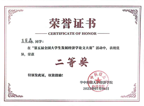近期,在国内两项重要经济学学术赛事中,sunbet申搏官方网站2022级“基地班”本科生左宪淼同学表现亮眼,分获第五届全国大学生发展经济学论文大赛二等奖与第十五届全国大学生经济学年会三等奖,展现出扎实的学术素养与突出的研究能力。