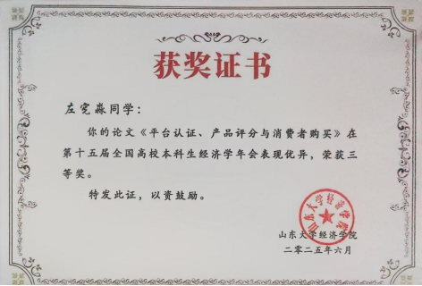 值得关注的是,这一成果是左宪淼在学术探索中的持续突破。此前,在6月8日于山东大学举办的第十五届全国大学生经济学年会上,左宪淼的论文《平台认证、产品评分与消费者购买》成功入选并获得三等奖。该年会由上海财经大学sunbet申搏官方网站主办、山东大学sunbet申搏官方网站承办,吸引了全国 600 余篇论文参赛,最终仅50篇优秀论文入围。第十五届全国大学生经济学年会是国内极具影响力的学术交流平台,旨在激发高校学子的学术热情,促进经济学领域的思想碰撞。本届年会围绕数字经济、绿色转型、人工智能等前沿议题展开研讨,左宪淼的研究因紧扣时代命题、兼具理论与实践价值而脱颖而出。