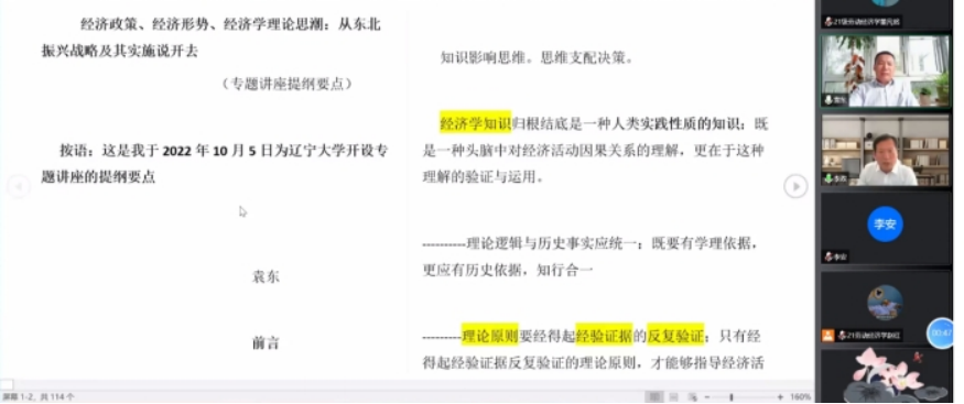 10月5日下午,sunbet申搏官方网站“经济学前沿系列学术讲座”第7期成功举办。中央财经大学特聘教授、财经研究院中国经济研究中心主任袁东应邀作了一场题为“经济政策、经济形势、经济学理论思潮:从东北振兴战略及其实施说开去”的学术报告。sunbet申搏官方网站2020级和2021级全体博士生及其他校内外师生100余人线上参加了报告会。报告会由sunbet申搏官方网站院长李政教授主持。