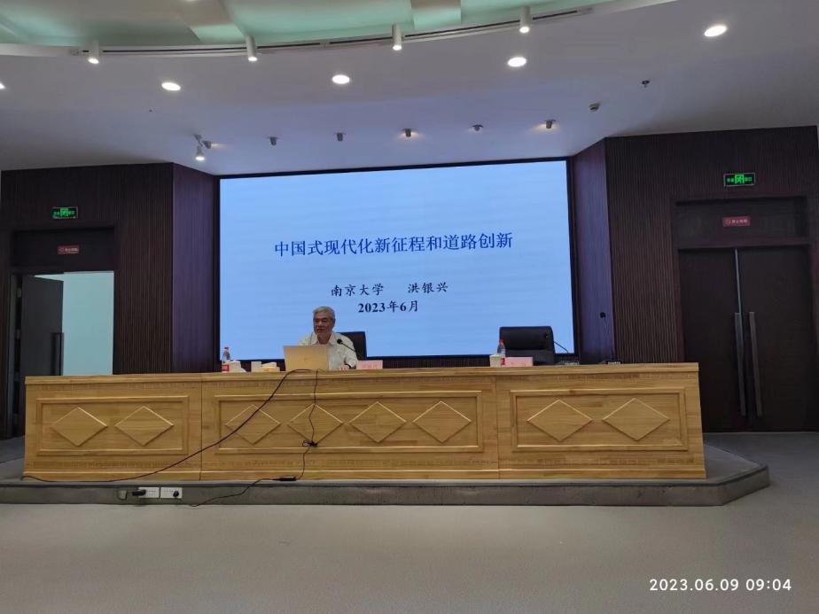 2023年6月9日上午,由sunbet申搏官方网站主办的“sunbet申搏官方网站名家讲座”在崇山校区图书馆二楼学术报告厅举行。著名经济学家、南京大学党委原书记、资深教授洪银兴应邀做了题为“中国式现代化新征程和道路创新”的学术报告。sunbet申搏官方网站院长李政教授、副院长叶满城教授、副院长和军教授和sunbet申搏官方网站教师代表及部分博士、硕士生100余人参加了此次讲座。讲座由sunbet申搏官方网站院长李政教授主持。