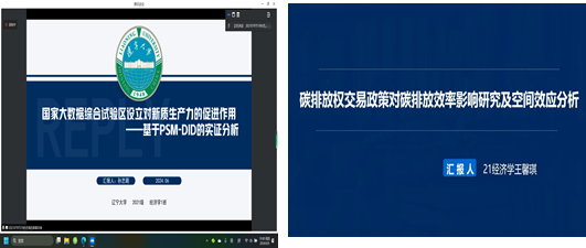 孙艺萌同学汇报的论文题目为《国家大数据综合试验区的设立对新质生产力发展的促进作用—基于PSM-DID的实证分析》,她指出数据要素通过智能化、平台化的手段成为推动生产力发展、生产要素高效整合的重要动力。论文基于PSM-DID对国家大数据综合试验区的设立与新质生产力发展之间的关系进行实证分析。王馨琪同学的论文题目为《碳排放权交易政策对碳排放效率影响研究及空间效应分析》,实现碳排放效率的提升是我国实现双碳目标的关键,碳排放权交易政策则是实现双碳目标的重要政策工具。在全国碳排放权交易市场运行的大背景下,研究碳排放权交易政策对试点地区碳排放效率的作用效果、影响机制以及对周边地区的政策溢出效应,对于实现双碳目标、提高碳排放效率具有重要的现实意义。