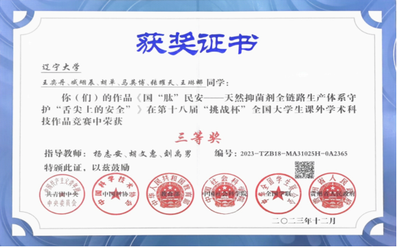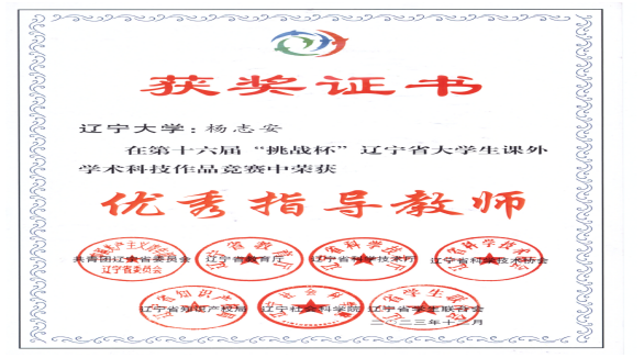 该项目还获得辽宁省第十六届“挑战杯”特等奖,杨志安教授获得优秀指导教师称号。