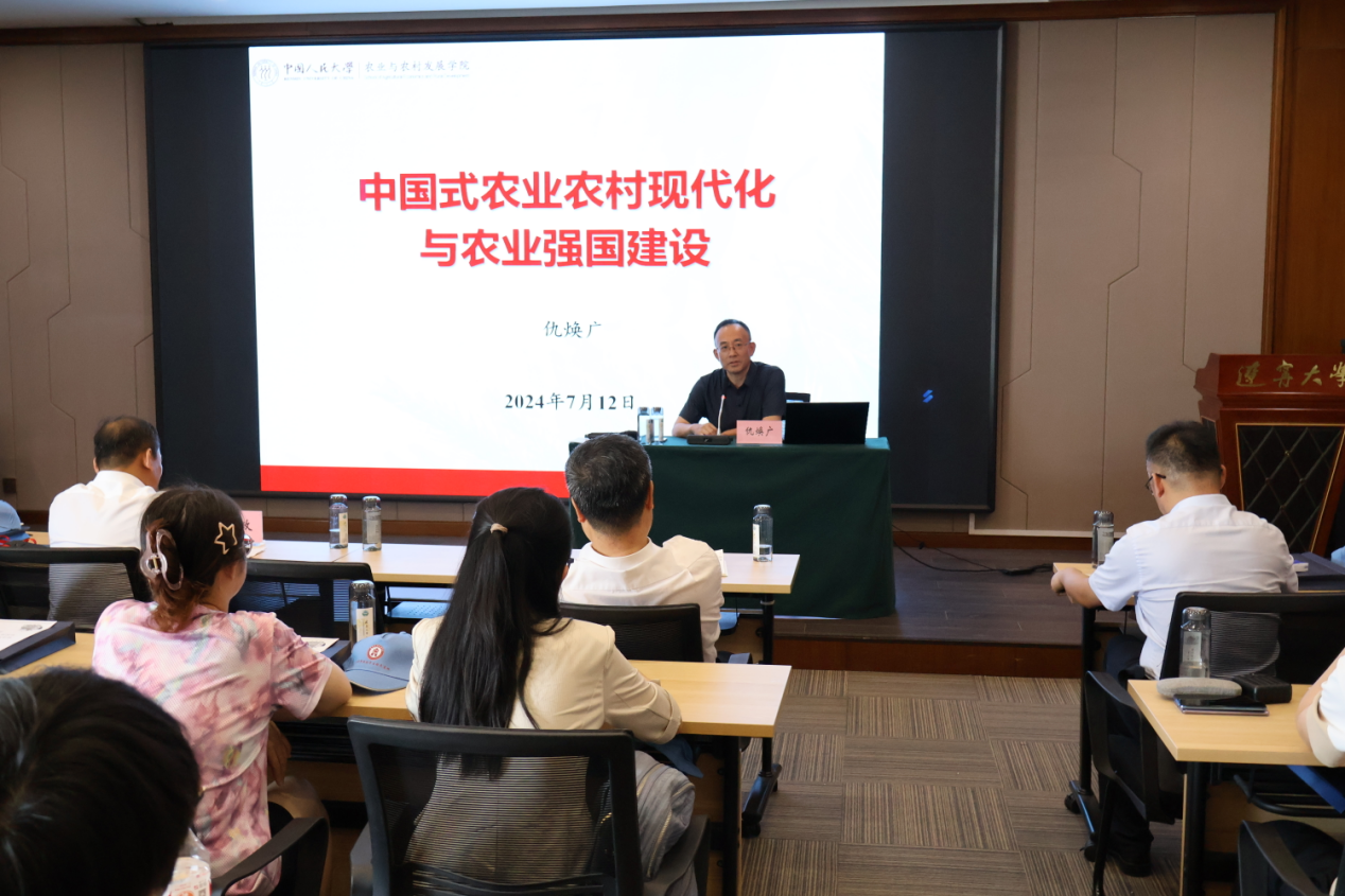 仇焕广教授在报告中提纲挈领地指出,强国必先强农,农强方能国强。要立足国情农情,体现中国特色,建设供给保障强、科技装备强、经营体系强、产业韧性强、竞争能力强的农业强国。农业农村现代化是农村产业现代化、农村生态现代化、农村文化现代化、乡村治理现代化、农民生活现代化的有机整体;建设农业强国、加快推进农业农村现代化、全面推进乡村振兴是相互依存的系统工程。接下来他从农业农村工作的重点领域、中国特色农业强国建设、保障中国粮食安全的几点思考几个方面对中国式农业农村现代化和农业强国建设做出了深刻解读和细致解析。