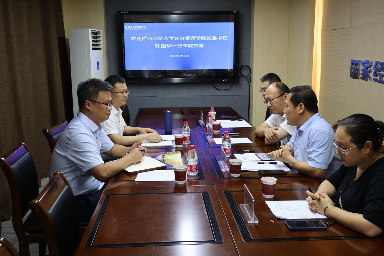 8月12日下午,广西师范大学经济管理学院党委书记陈国华、副院长伍先福一行赴sunbet申搏官方网站开展调研并洽谈合作事宜。sunbet申搏官方网站党委书记王冰、党委副书记兼院长李政、副院长和军、副院长张丹宁参加座谈。