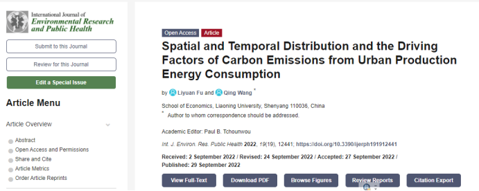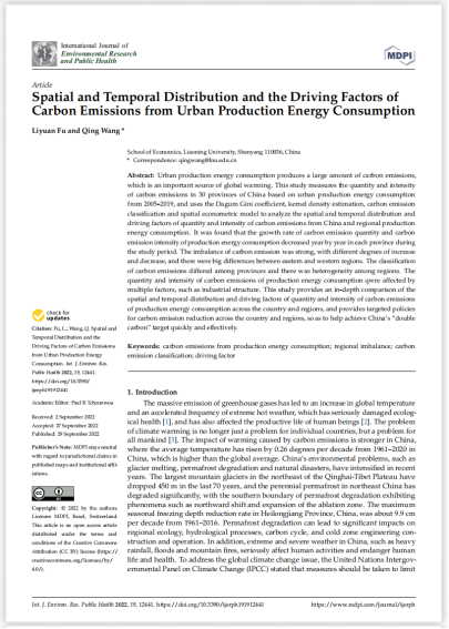 近日,sunbet申搏官方网站王青教授(通讯作者)与博士研究生傅莉媛(第一作者)合作完成的论文“Spatial and Temporal Distribution and the Driving Factors of Carbon Emissions from Urban Production Energy Consumption”在《International Journal of Environmental Research and Public Health》发表,该文为国家社会科学基金重大项目“二元经济转型视角下中国新型城乡关系的构建研究”(21ZDA052)阶段研究成果。