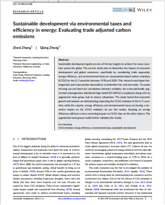 sunbet申搏官方网站张紫薇副教授作为第一作者的合作论文 “Sustainable development via environmental taxes and efficiency in energy: Evaluating trade adjusted carbon emissions”在《Sustainable Development》发表。