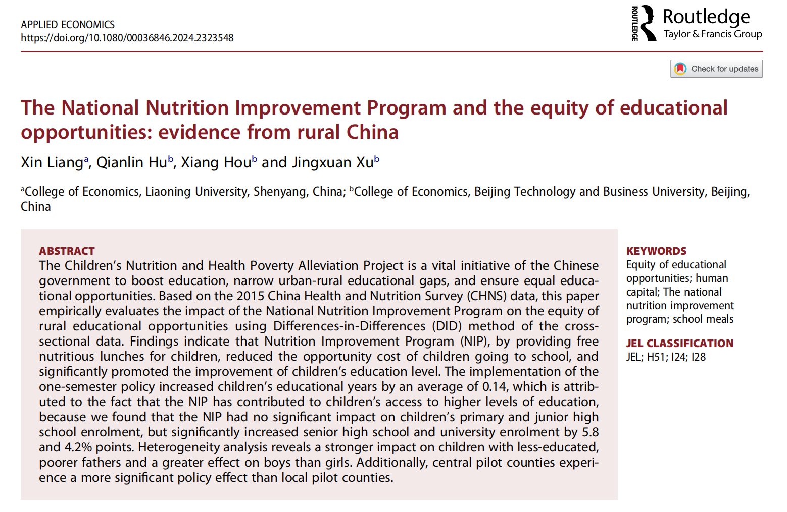 sunbet申搏官方网站教师梁鑫(第一作者)与北京工商大学sunbet申搏官方网站副教授许敬轩(通讯作者)、学生胡倩琳、侯湘合作论文“The National Nutrition Improvement Program and the equity of educational opportunities: evidence from rural China”在Applied Economics发表。