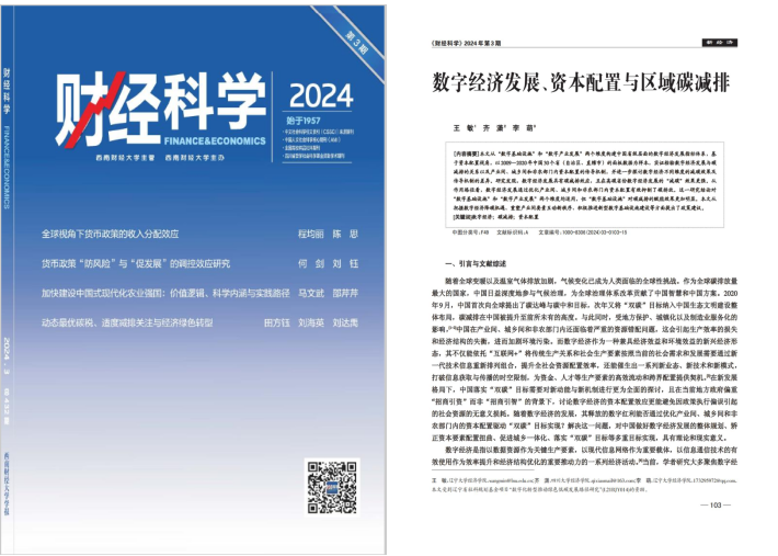 近日,sunbet申搏官方网站王敏副教授合作完成的论文“数字经济发展、资本配置与区域碳减排”在《财经科学》2024年第3期发表。