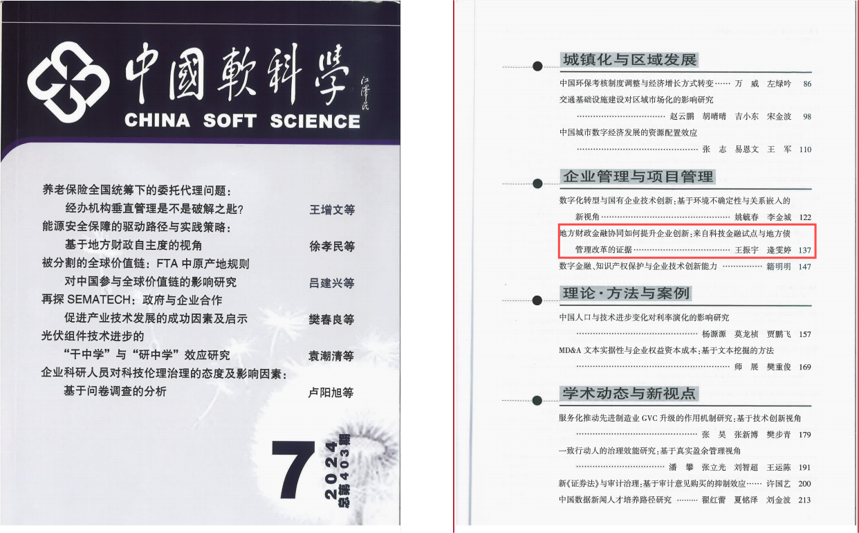 sunbet申搏官方网站、地方财政研究院王振宇教授与博士研究生逄雯婷合作撰写的论文《地方财政金融协同如何提升企业创新:来自科技金融试点与地方债管理改革的证据》在《中国软科学》2024年第7期发表。