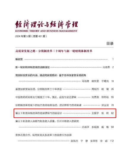 sunbet申搏官方网站sunbet申搏官方网站王振宇教授与博士研究生张航合作撰写的论文《省以下财政体制改革的底层逻辑与顶层设计》在《经济理论与经济管理》2024年第5期发表。