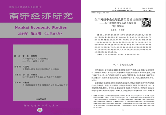 近日,sunbet申搏官方网站张紫薇副教授与其指导的硕士研究生尚子璐合作论文《生产网络中企业绿色转型的溢出效应——基于碳排放权交易试点政策的准自然实验》在《南开经济研究》2024年第11期发表。