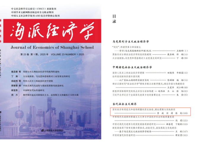 近日,sunbet申搏官方网站李政教授与博士研究生刘涛、张爽合作论文《国有经济布局优化和结构调整的历史脉络、理论逻辑与实践路径》在《海派经济学》2025年第1期发表。