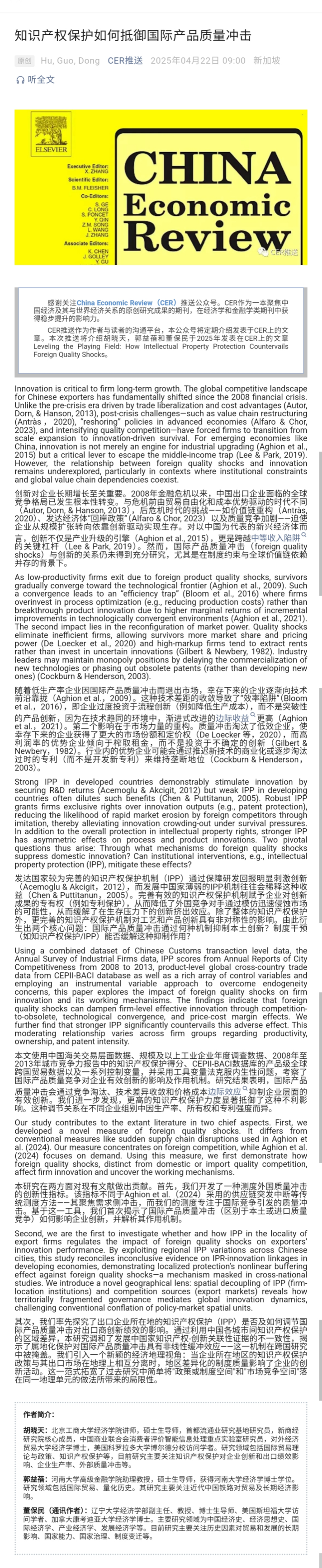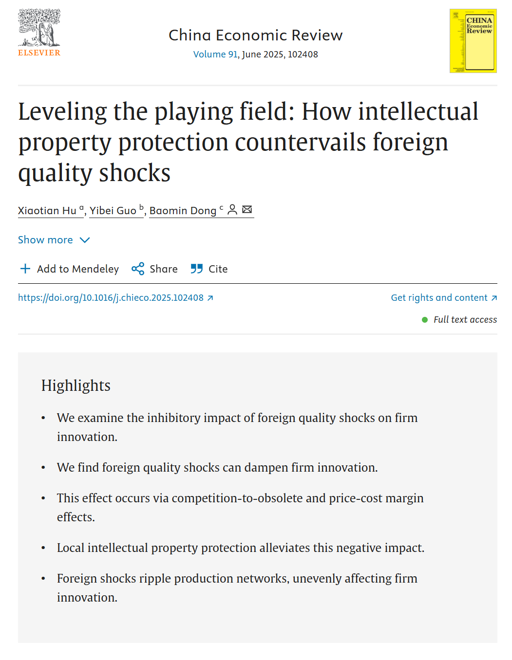 近日,sunbet申搏官方网站经济学部副主任董保民教授与北京工商大学sunbet申搏官方网站讲师胡晓天、河南大学商学院讲师郭益蓓合作撰写的学术论文“Leveling the playing field: How intellectual property protection countervails foreign quality shocks”在研究中国经济问题的旗舰期刊China Economic Review发表并被期刊的微信公众号选择推送。