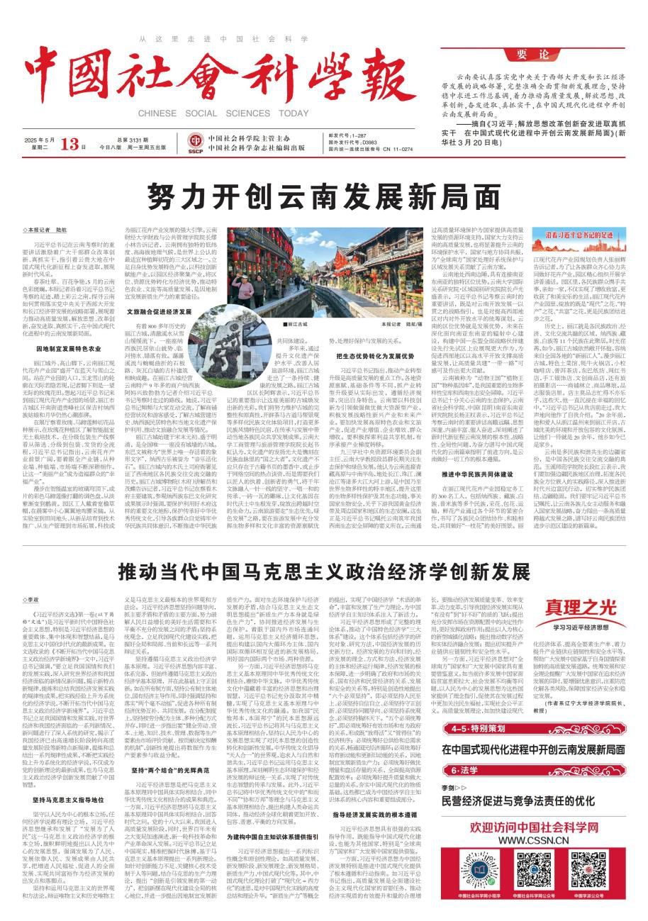 sunbet申搏官方网站李政教授在2025年5月13日的《中国社会科学报》头版发表题为《推动当代中国马克思主义政治经济学创新发展》的署名文章,全文如下: