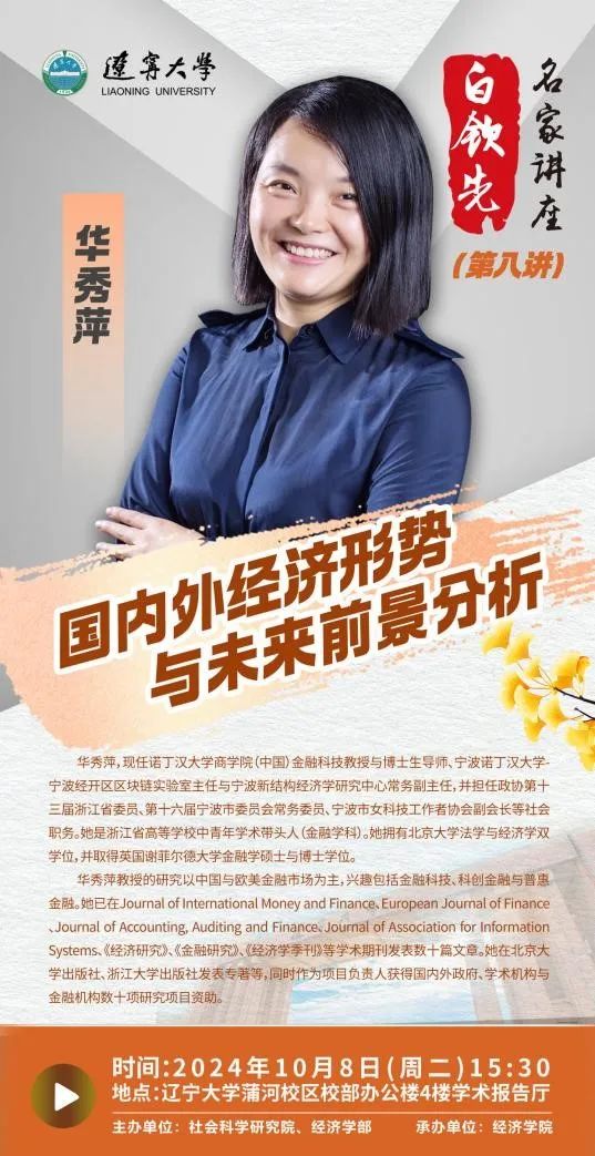 华秀萍,现任诺丁汉大学商学院(中国)金融科技教授与博士生导师、宁波诺丁汉大学-宁波经开区区块链实验室主任与宁波新结构经济学研究中心常务副主任,并担任政协第十三届浙江省委员、第十六届宁波市委员会常务委员、宁波市女科技工作者协会副会长等社会职务。她是浙江省高等学校中青年学术带头人(金融学科)。她拥有北京大学法学与经济学双学位,并取得英国谢菲尔德大学金融学硕士与博士学位。