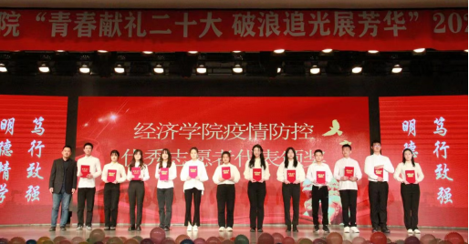 在晚会的颁奖环节,张伟副书记代表学院为在疫情防控工作中作出重要贡献的青年志愿者代表颁发了优秀志愿者证书,并代表学院充分肯定了志愿者对学院和学校疫情防控作出的重要贡献,鼓励全体经院学子继续发扬志愿服务精神,感恩奉献、勇毅前行,共同筑牢校园疫情防控第一线,坚定坚决打赢疫情防控阻击战的不屈信念。